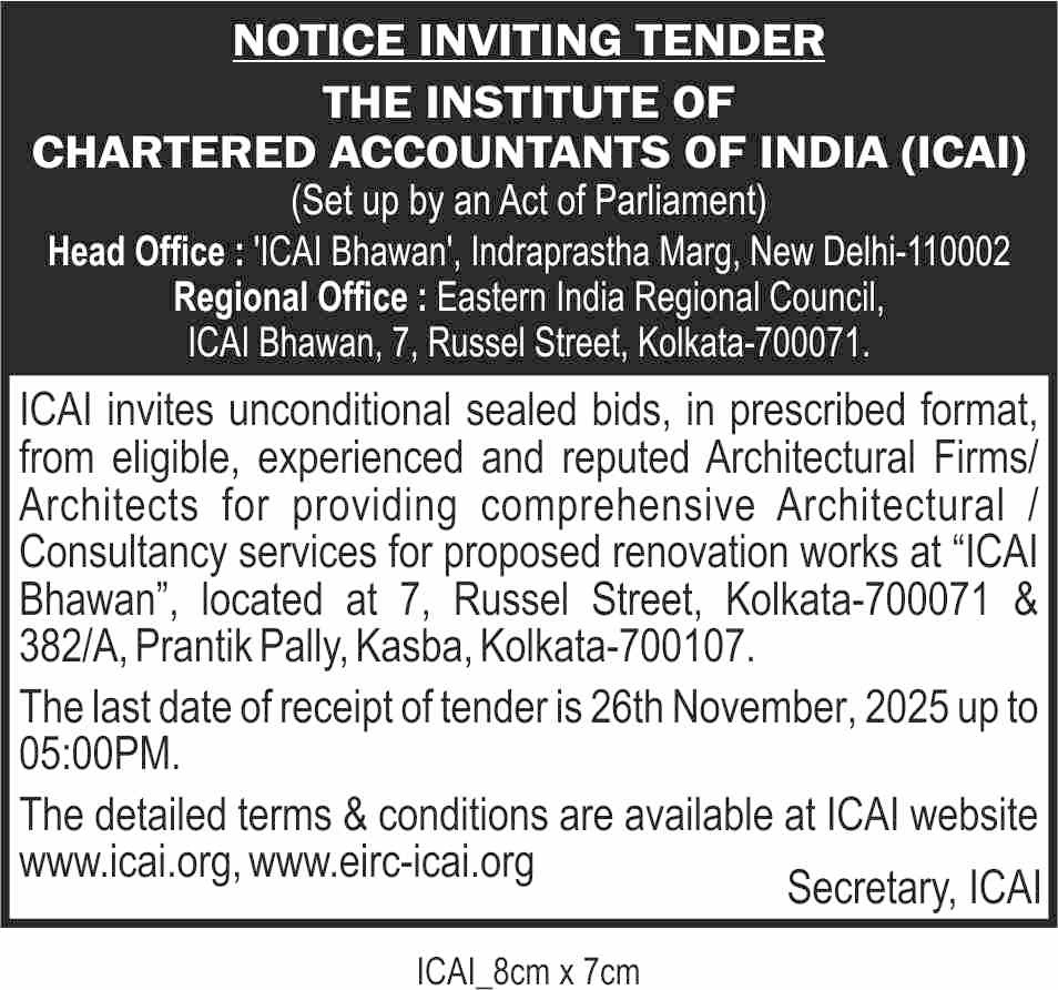 APPOINTMENT OF ARCHITECT/CONSULTANT FOR PROVIDING COMPREHENSIVE ARCHITECTURAL AND CONSULTANCY SERVICES FOR THE PROPOSED RENOVATION WORKS at “ICAI BHAWAN” located at 7,Russel Street, Kolkata -