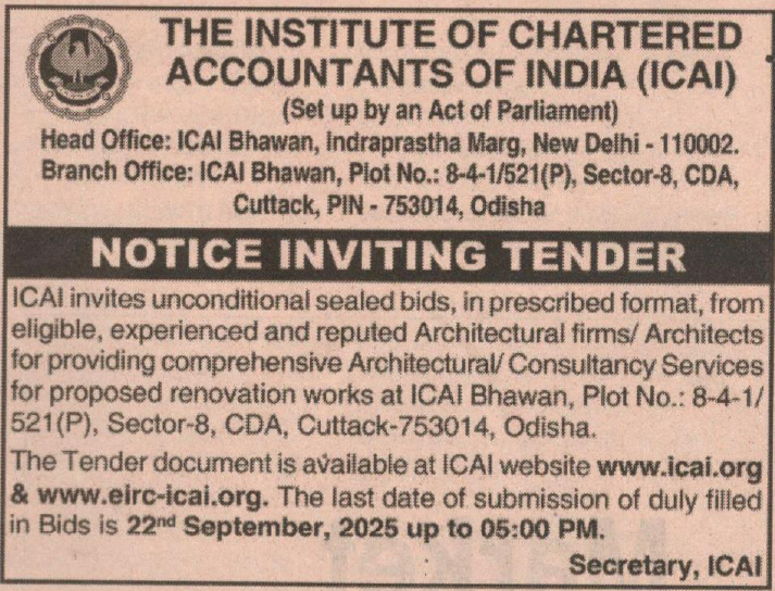 APPOINTMENT OF ARCHITECT/CONSULTANT FOR PROVIDING COMPREHENSIVE ARCHITECTURAL AND CONSULTANCY SERVICES FOR THE PROPOSED RENOVATION WORKS at “ICAI BHAWAN”, PLOT NO. 8-4-1/521(P), SECTOR-8, CDA, CUTTACK-753014, ODISHA