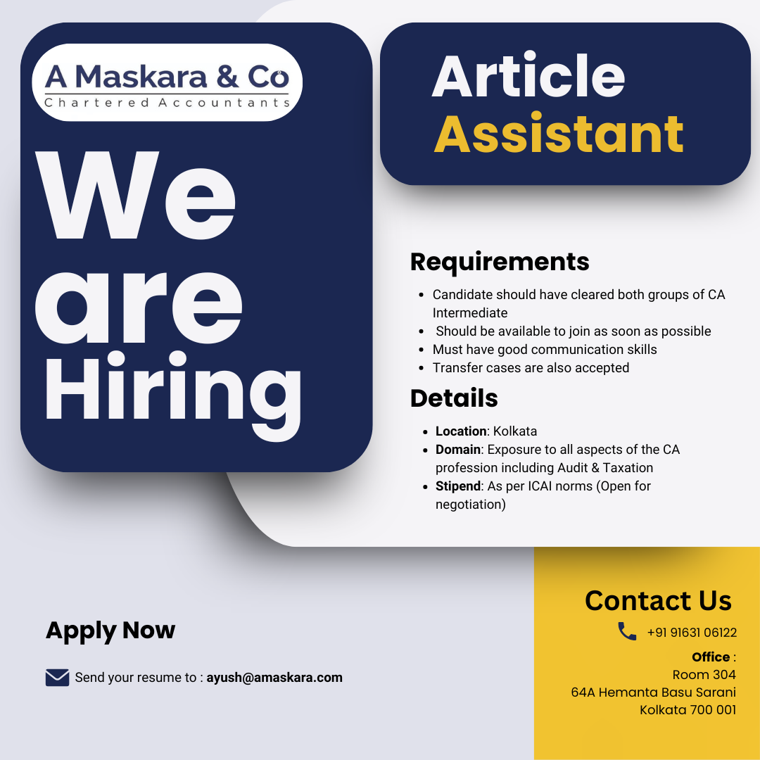 A Maskara & Co[dot], Chartered Accountants is looking for Article Assistants who want to pursue their CA Articleship[dot] ? Location: Kolkata ? Domain: Exposure to all aspects of the CA profession including Audit & Taxation ? Stipend: As per ICAI norms (Open for negotiation) Requirements: • Candidate should have cleared both groups of CA Intermediate • Should be available to join as soon as possible • Must have good communication skills • Transfer cases are also accepted ? Interested candidates may share their resume at: ayush[at]amaskara[dot]com